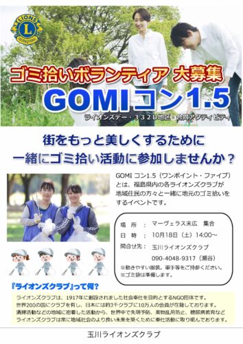 「GOMIコン 1.5」を開催しました。玉川ライオンズクラブでは、3チームに分かれ、村内のゴミ拾いをしました。